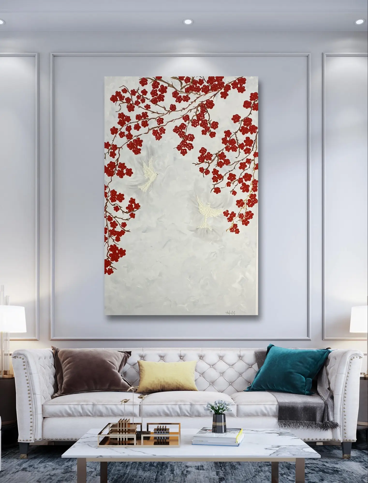 Delicate yet vivid, each blossom adds texture and movement, while two doves perched gently on a branch mirror one another in serene unity. Their white-gray feathers contrast the fiery reds of the maple, yet their presence completes the tranquil scene. Their gaze speaks of peace, their posture of love and balance.