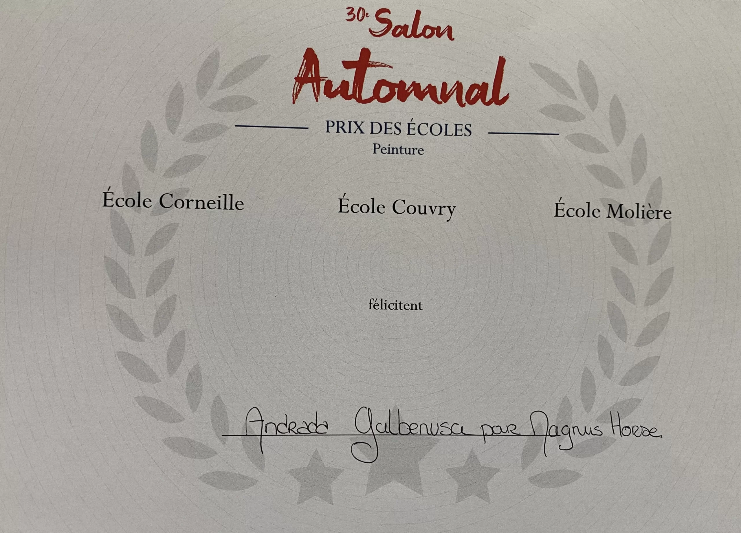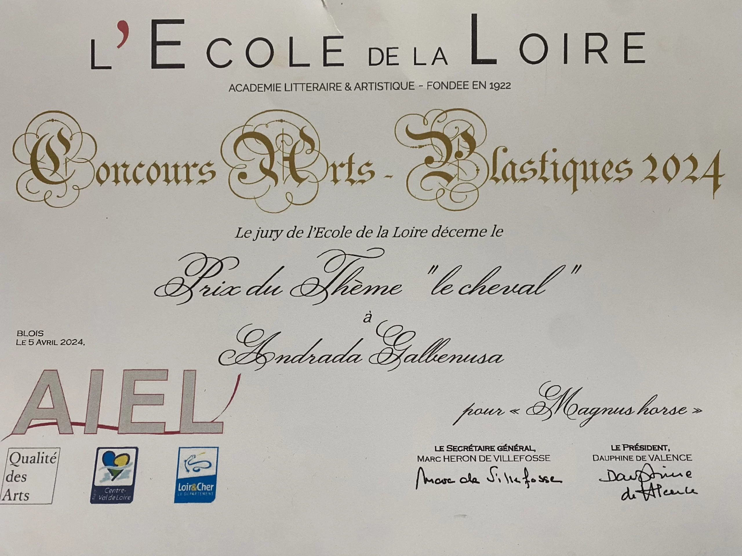 The painting “Magnus Horse” has won two awards in Paris following the 2024 Fine Art Competition organized by the literary and artistic academy « Ecole de la Loire » (founded in 1922), and the second prize offered by « Salon Automnal », Paris, France.