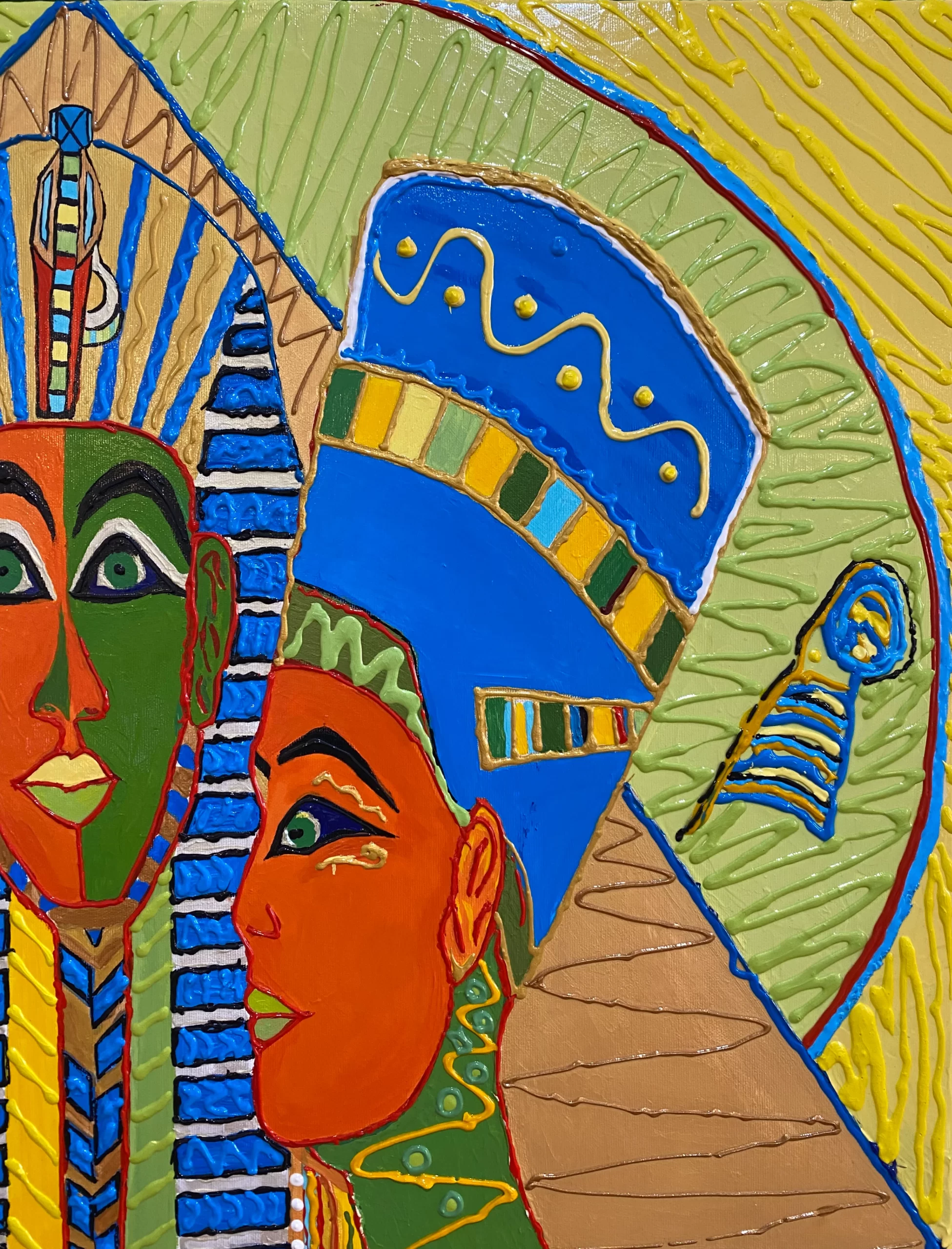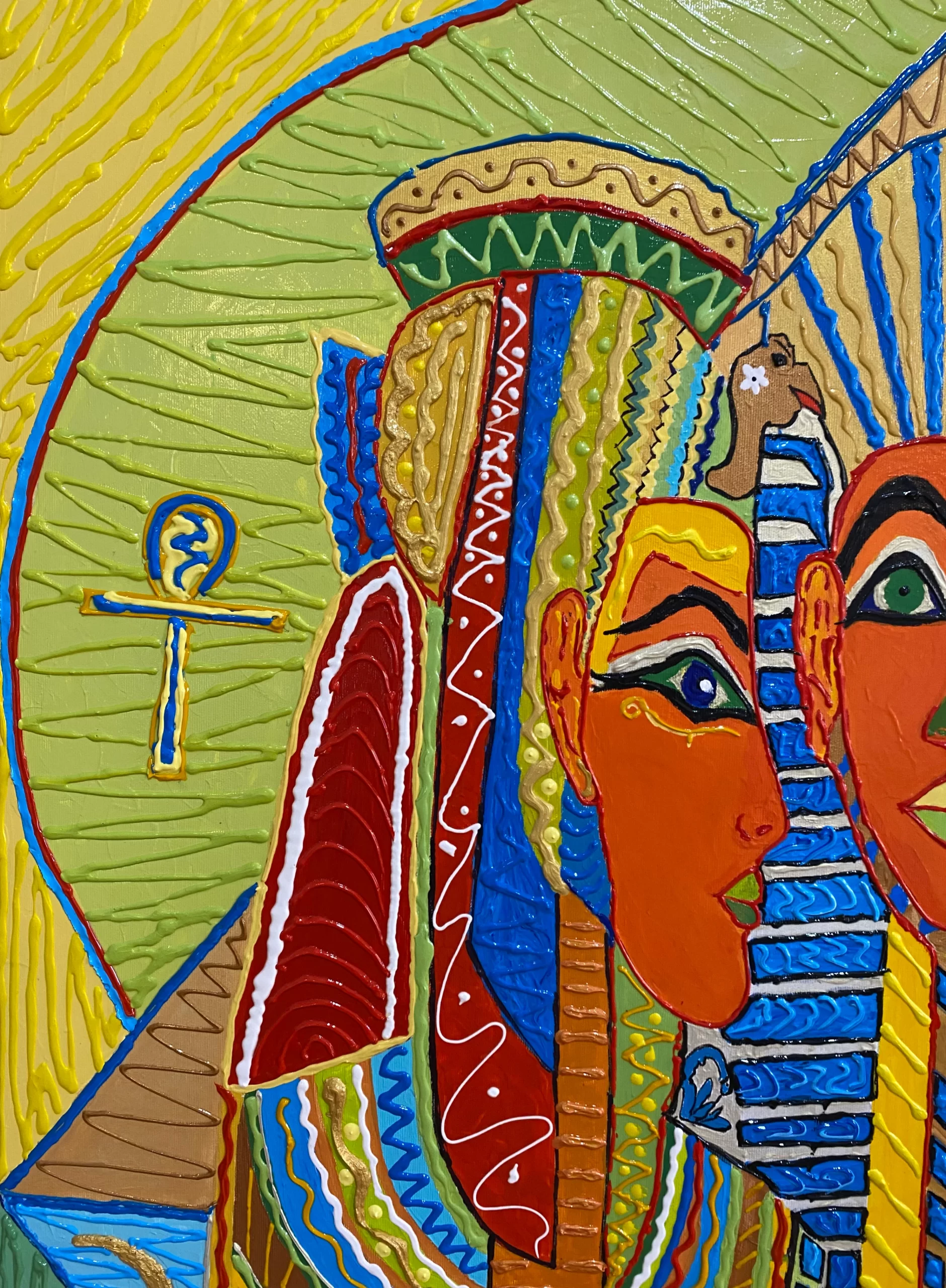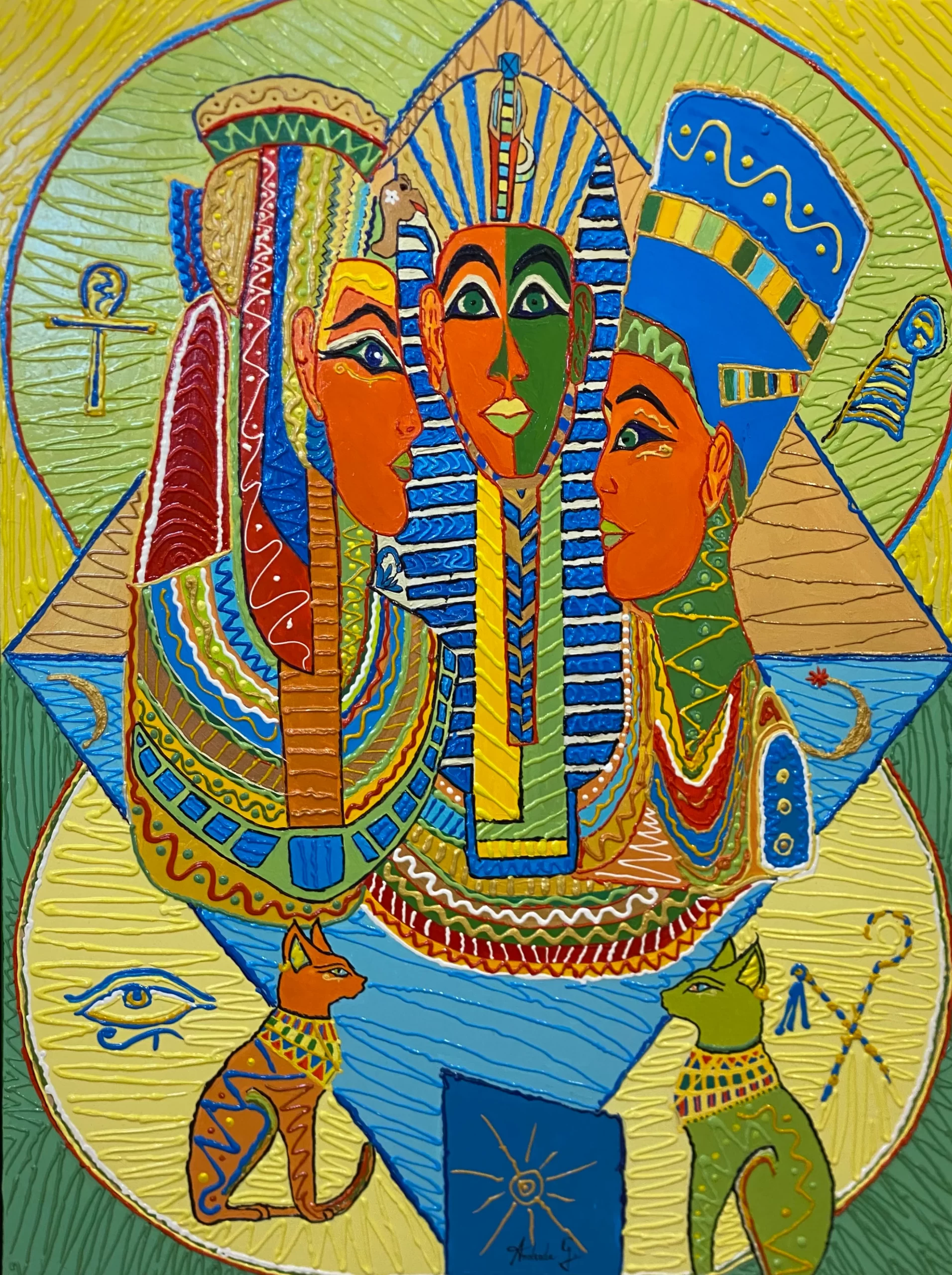 The Mystery of the Sun Kings” is a contemporary reinterpretation of Egyptian mythology and royalty, merging ancient symbols with the vivid expressiveness of modern art. This painting radiates vitality, power, and sacred energy, inviting the viewer into a world where the past and present coexist.