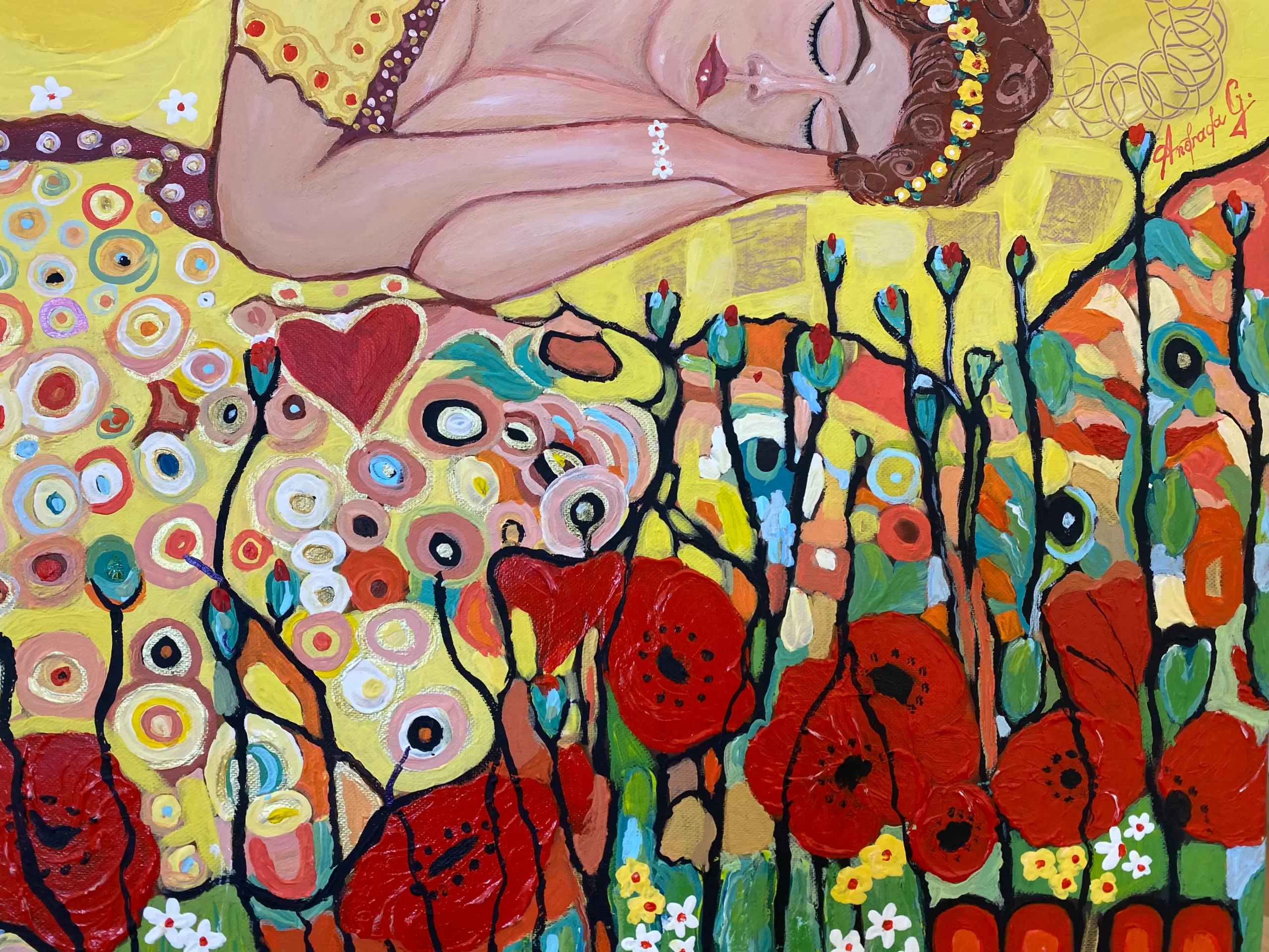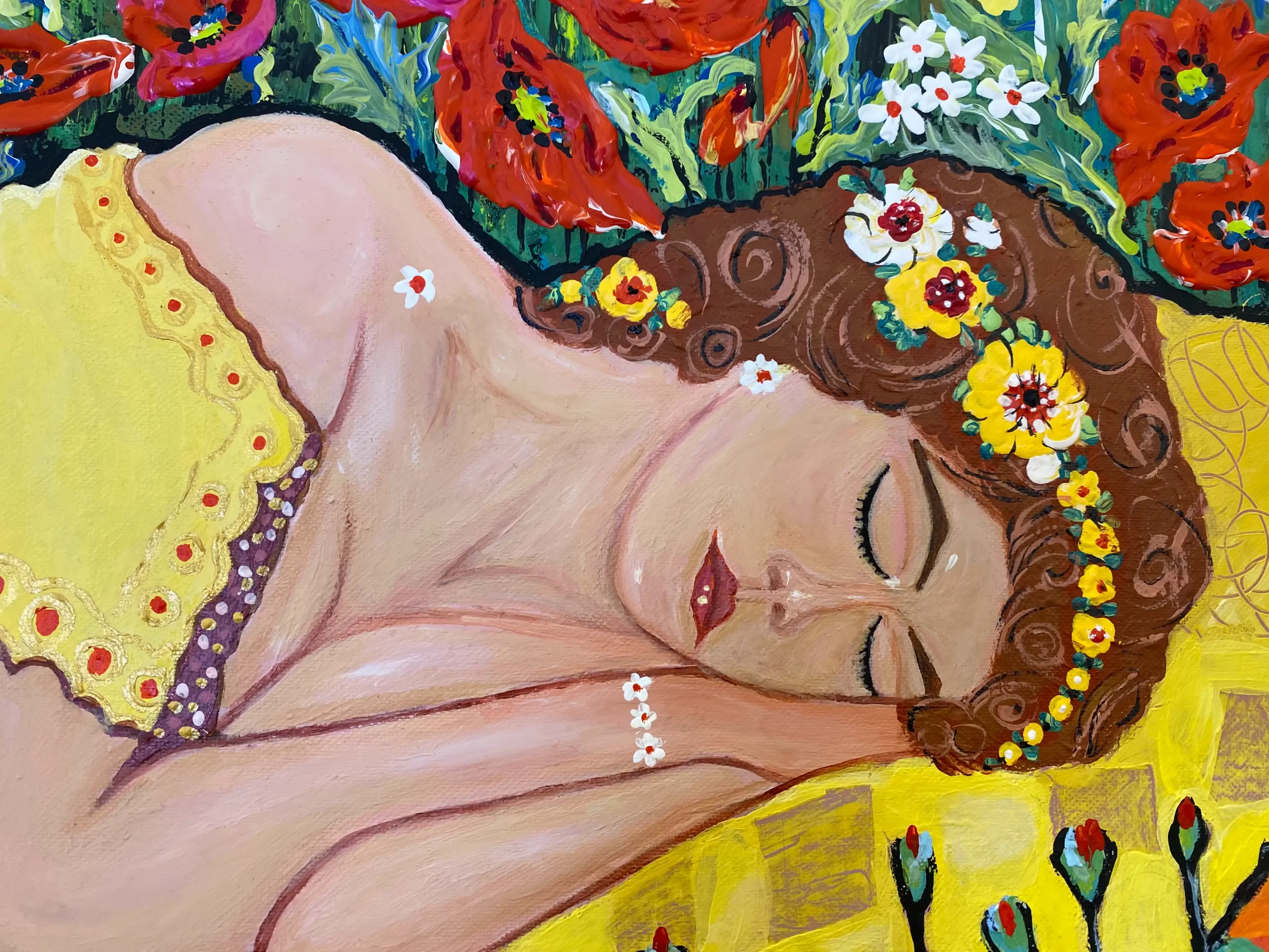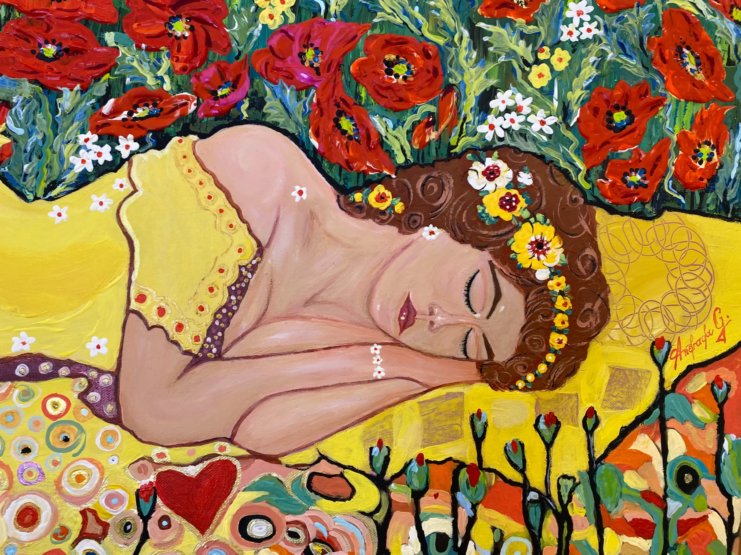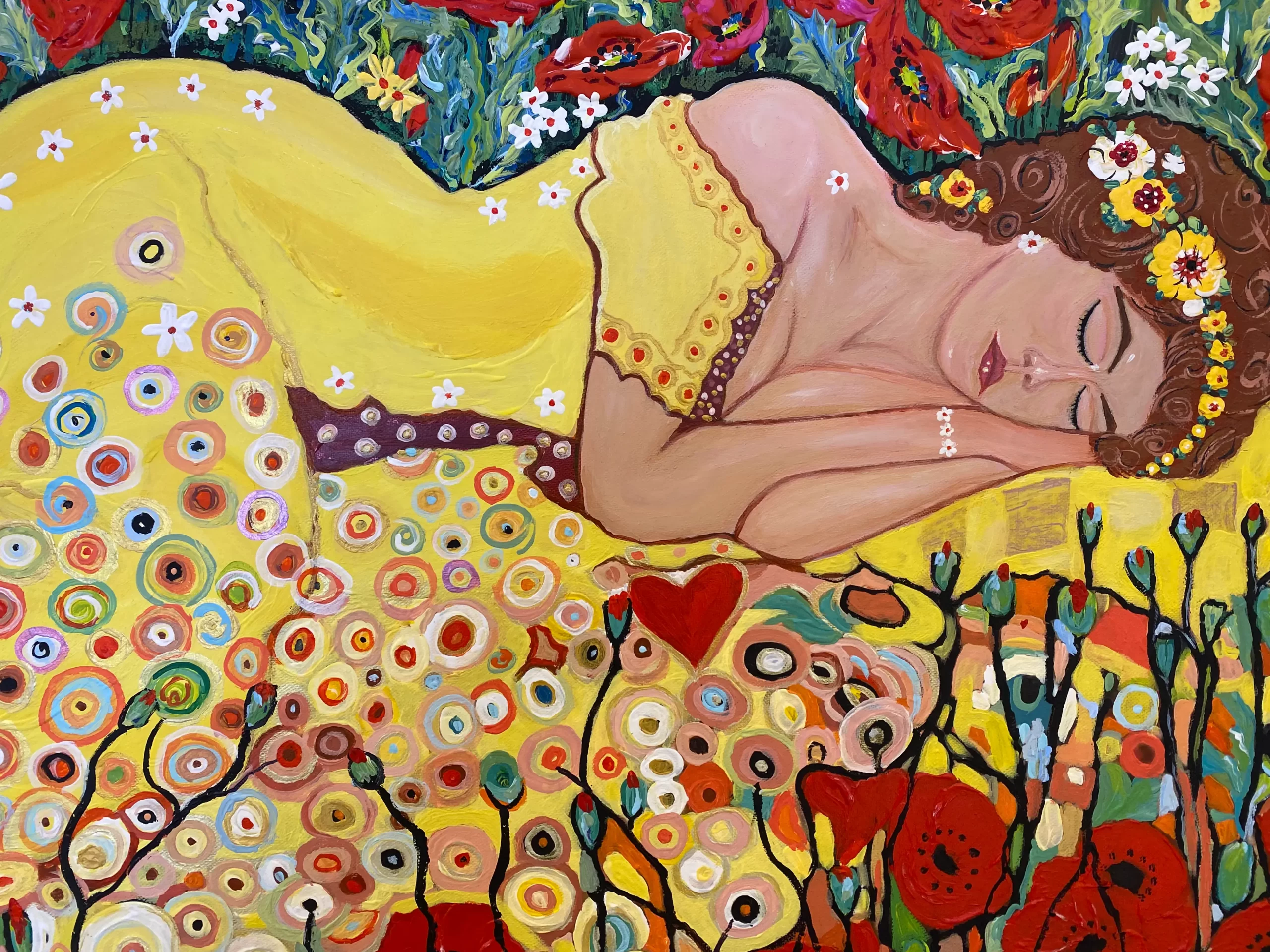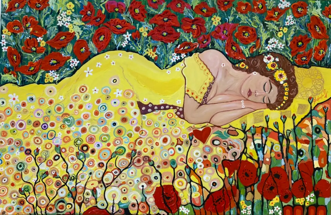 The surrounding poppies dominate the scene with their vivid reds, creating a visual contrast between the energy of nature and the stillness of sleep. The flowers seem to sway protectively, embracing her slumber.